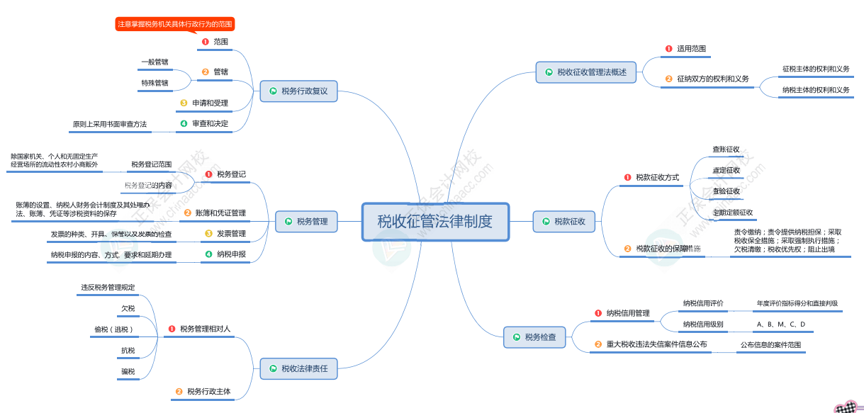 下面是2023初级会计《经济法基础》思维导图:第七章 税收征管法律制度的相关内容,一起来学习吧!