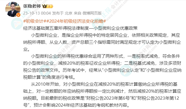 正保会计网校“张稳老师”来助力啦~老师在个人微博上发布关于:第五章所得税法律制度—小型微利企业优惠政策 的知识点变化前瞻,大家可以参考:(PS:点击图片可以查看大图哟~)