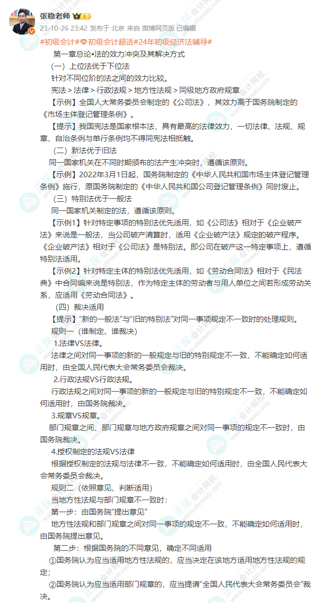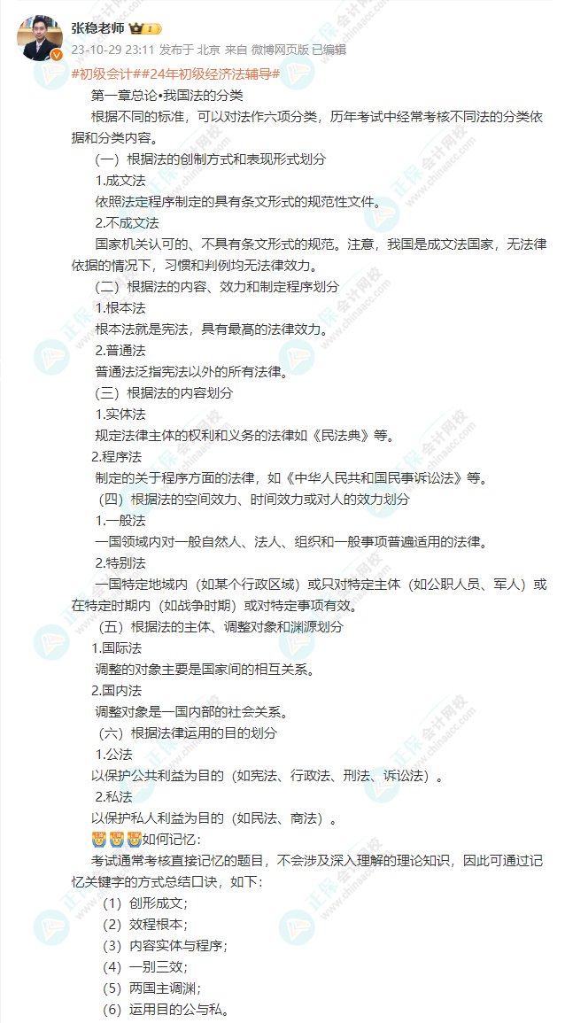 由正保会计网校“张稳老师”在个人微博上分享关于:第一章 总论-我国法的分类 相关知识点,同时给到大家需要注意的细节、记忆口诀,一起学习咯:(PS:点击图片可以查看大图哟~)