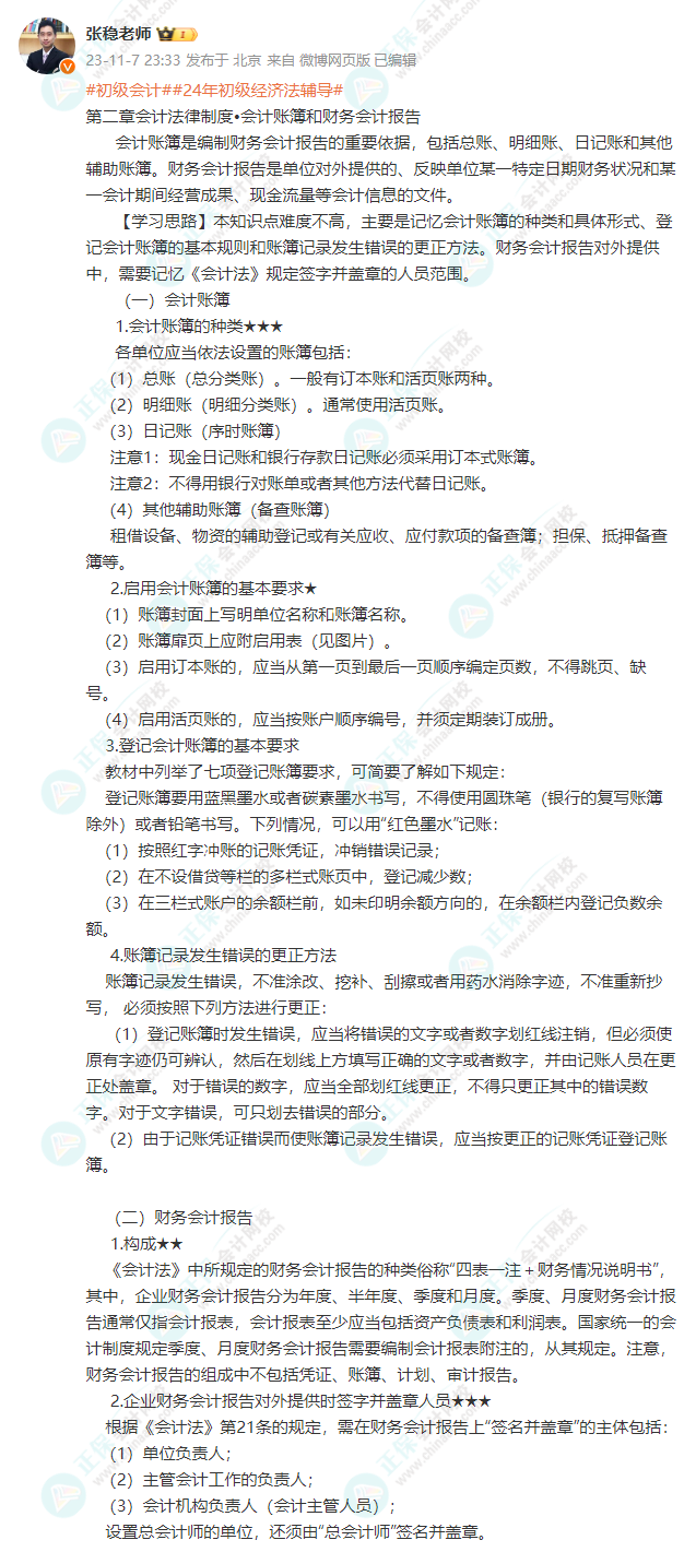 老师在个人微博上分享知识点学习,本次主要关于:第二章会计法律制度-会计账簿和财务会计报告 相关知识点,同时给到大家学习思路等,快学!(PS:点击图片/保存可以查看大图哟~)