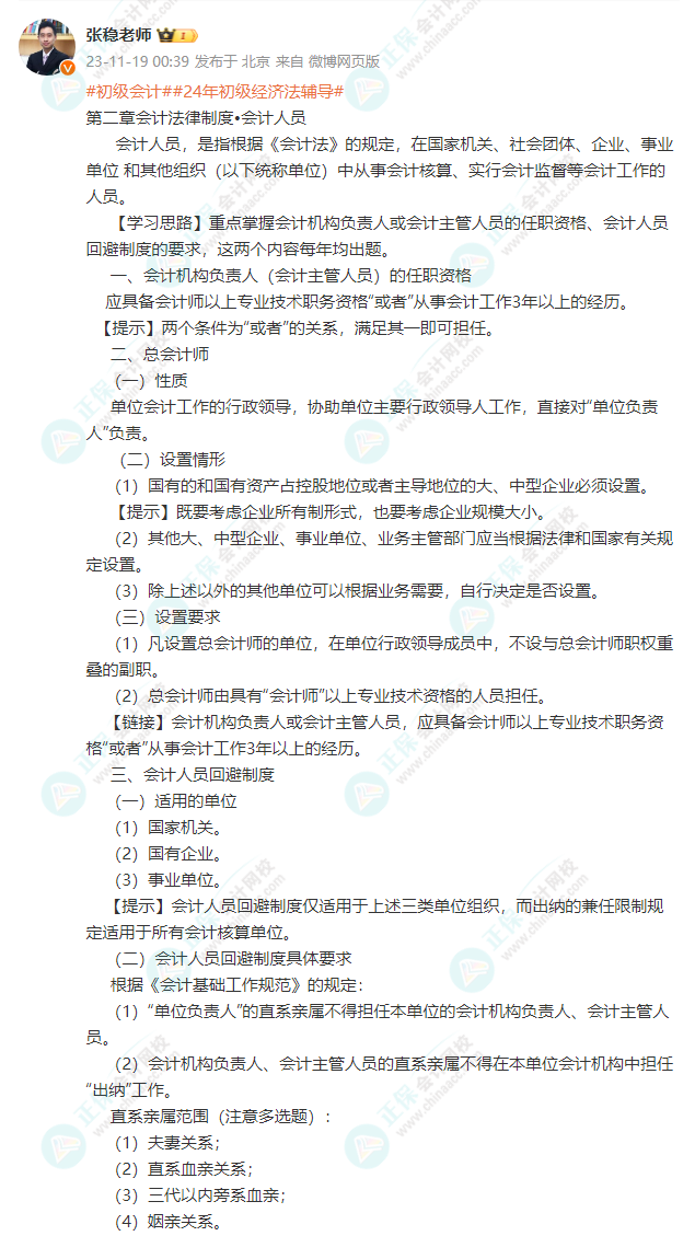 建议零基础考生可以动手开始学习啦~张稳老师在个人微博上分享的:第二章会计法律制度-会计人员 相关知识点,同时给到大家学习思路和学习提示等,快学!(PS:点击图片/保存可以查看大图哟~)