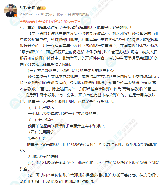 正保会计网校张稳老师在个人微博上分享:第三章支付结算法律制度-单位银行结算账户•预算单位零余额账户 相关知识点,同时给到大家学习思路、学习提示等,抓紧学习吧!(PS:点击图片/保存可以查看大图哟~)