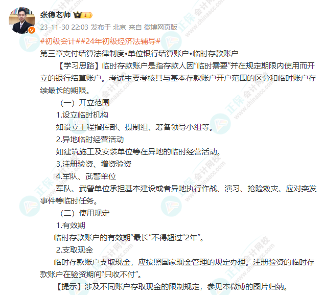 初级会计考试关于银行结算账户的知识点有很多,正保会计网校张稳老师在个人微博上分享:第三章支付结算法律制度-单位银行结算账户•临时存款账户 相关知识点,同时给到大家学习思路,跟着老师提前学起来吧!(PS:点击图片/保存可以查看大图哟~)