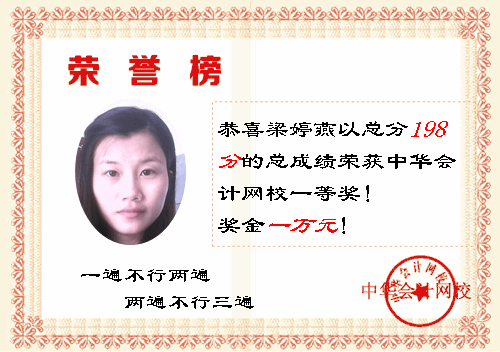 根据2014年奖学金申报情况,初级职称高分学员、单科满分学员、全科通过学员层出不穷。其中学员梁婷燕以经济法基础100分、初级会计实务98分的成绩,荣获正保会计网校一等奖!奖金一万元!