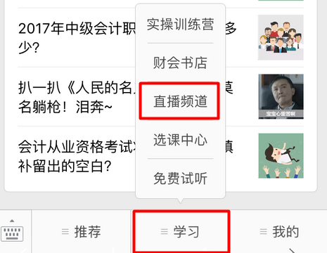 微信直播参与方式二:关注正保会计网校微信官方公众号,微信号:wx_chinaacc,点击菜单【学习】——【直播频道】——进入本次直播交流教室。