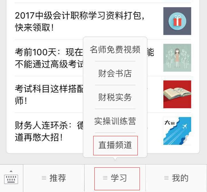 参与方式二:关注正保会计网校微信官方公众号,微信号:wx_chinaacc,点击菜单【学习】——【直播频道】——进入本次直播交流教室。
