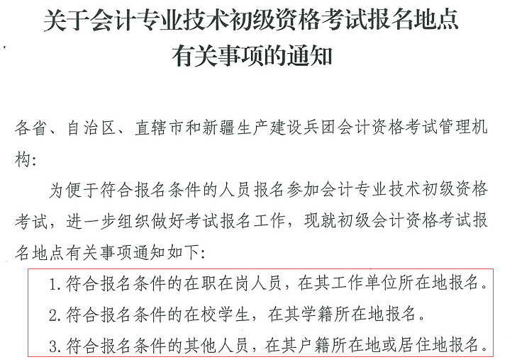 关于会计专业技术初级资格考试报名地点有关事项的通知