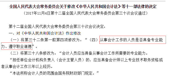 传的沸沸扬扬的“会计从业考试取消”的消息于2017年11月5日尘埃落定,新《会计法》明确取消了会计从业考试,对从事会计工作的要求由“必须具有会计从业资格证书”调整为了“从事会计工作的人员是否具备专业能力、遵守职业道德”,会计从业证不再是会计入门证书。而2018年初级会计职称考试报考简章中也取消了会计证的限制,没有参加从业考试的考生可以直接报考初级了。可想而知,不管有从业证还是没有从业证,都将加入初级报考大军。