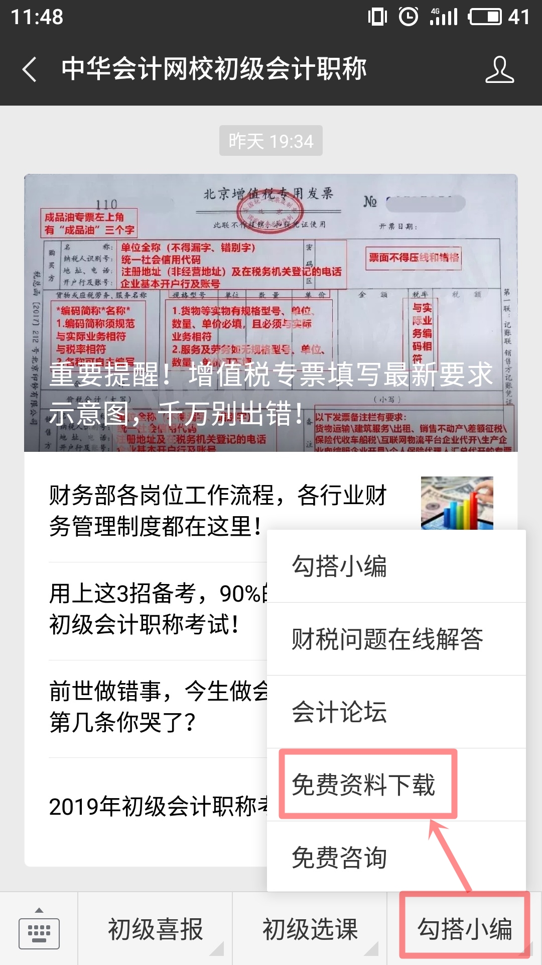 (3)微信公众号:首先需要关注“正保会计网校初级会计职称”微信公众号呦,然后点击“勾搭小编”选择“免费资料下载”。