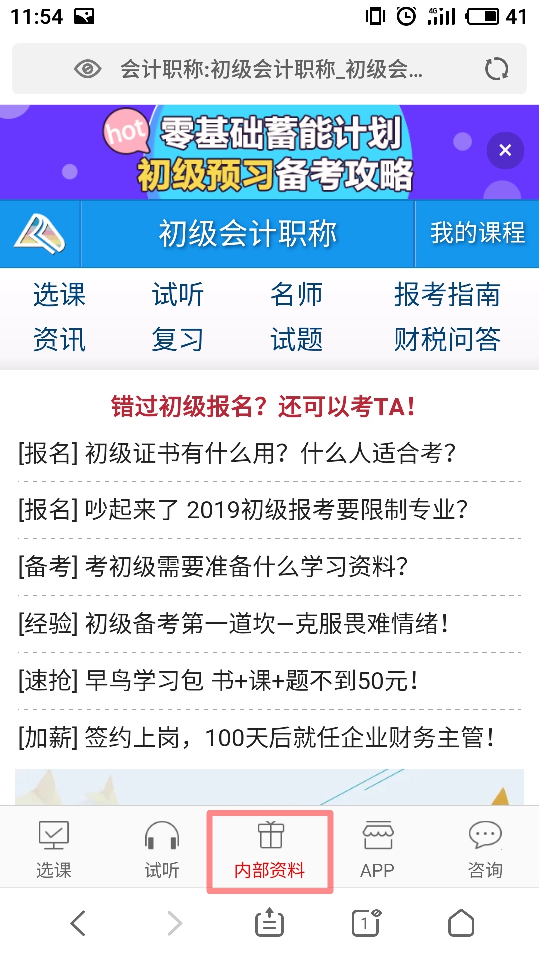 (2)手机端:进入正保会计网校官方网站,进入初级职称栏目,点击最下方“内部资料”。
