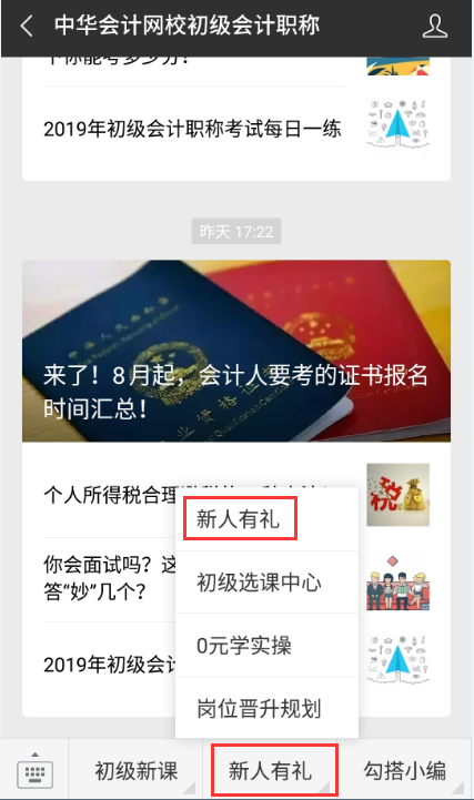 扫描下方二维码,关注正保会计网校微信公众号,注册登录后即可在“新人有礼”栏目领取优惠券,领取位置如下图所示: