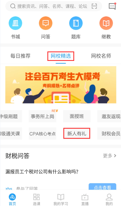 扫描下载正保会计网校App,在“网校精选”栏目,即可点击“新人有礼”领取优惠券,下载二维码和操作方式如下所示: