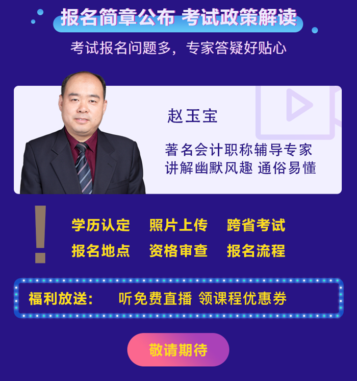 2019年初级会计全国报名简章预计在近期公布,网校老师赵玉宝将为大家解读报考政策,敬请期待哦。