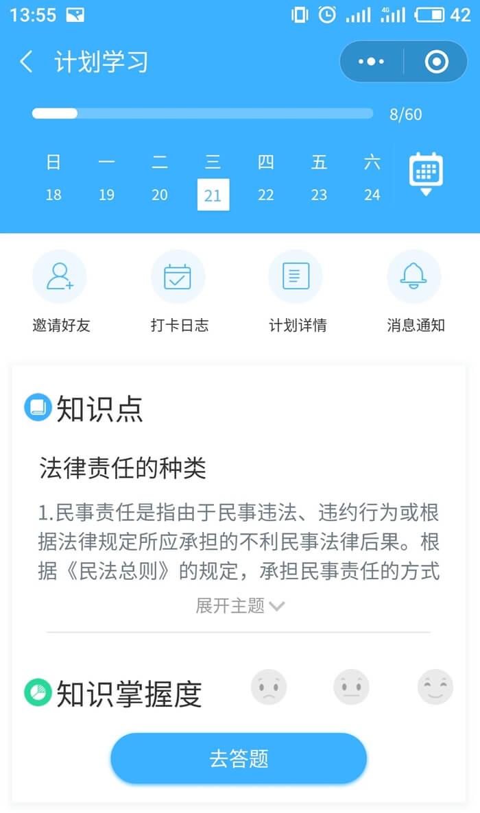 2. 每天一个考试必学知识点 + 5道选择题,答完即为打卡成功,每天进步一点点,成功是可以量化滴!