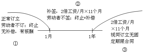 (2)自用工之日起超过1个月不满1年未订立:补签;每月支付2倍的工资。
