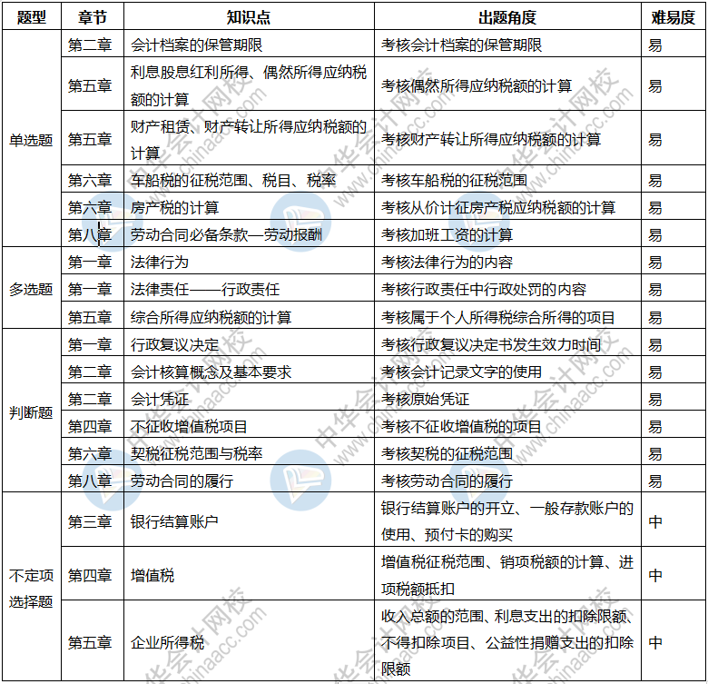 从上面的表格可以看出,经济法基础的考试题目多为常规题目,教材原文考核内容较多,题目难度整体偏低,不定项选择题主要集中在银行结算账户、增值税和企业所得税。