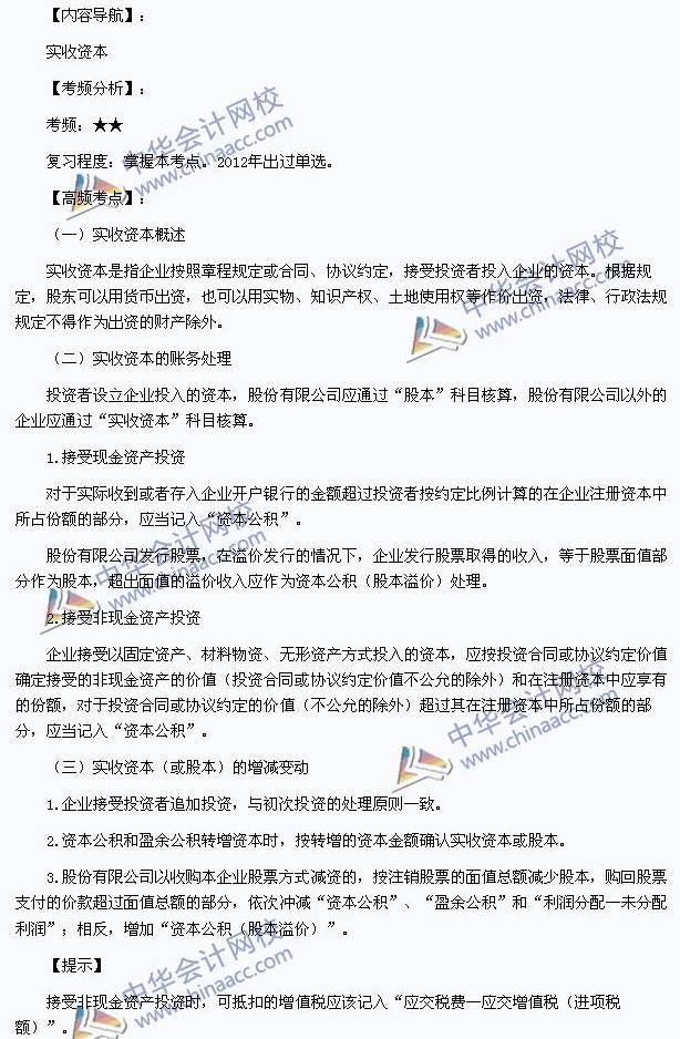 我们一起来学习2013初级会计职称《初级会计实务》高频考点:实收资本。本考点属于《初级会计实务》第三章所有者权益第一节实收资本的内容。