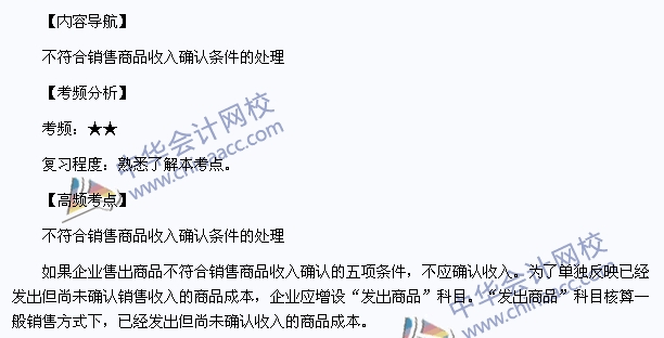 我们一起来学习2013年初级会计职称《初级会计实务》高频考点:不符合销售商品收入确认条件的处理。本考点属于《初级会计实务》第四章收入第一节销售商品收入的内容。