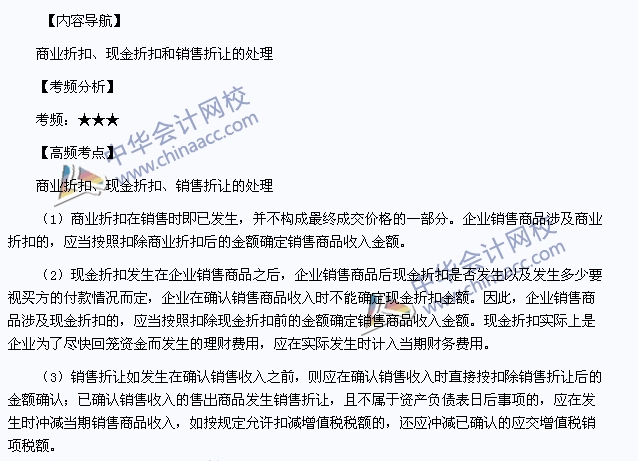 我们一起来学习2013年初级会计职称《初级会计实务》高频考点:商业折扣、现金折扣和销售折让的处理。本考点属于《初级会计实务》第四章收入第一节销售商品收入的内容。