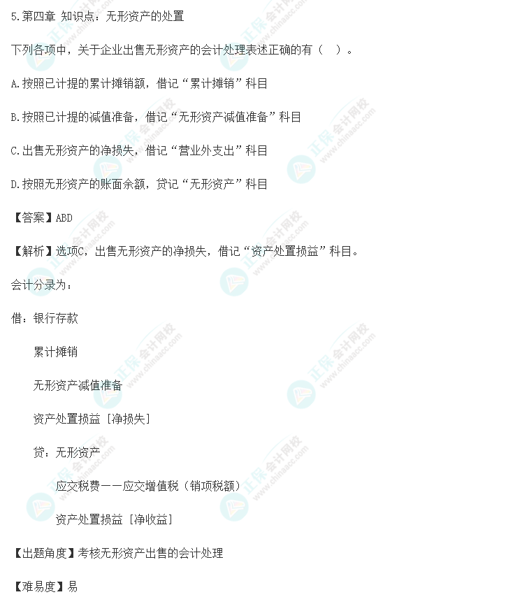 【点评】本题考核“无形资产的处置”知识点。该题目所涉及知识点在下列正保会计网校(www.fawtography.com)2023年初级职称《初级会计实务》辅导中均有体现: