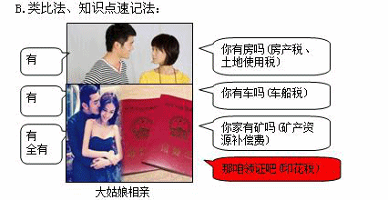 一个姑娘一个小伙,相亲来了。姑娘问:你有房吗(房产税、房子不得有土地吗?还涉及土地使用税)?男的回答:有。女的问:你有车吗(车船税)?男的回答:有。女的问:你家有矿吗(矿产资源补偿费)?男的说:有,全有!女的说:那咱俩领证吧(印花税)!四税一费就记住了。