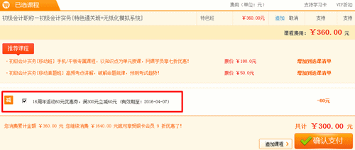 为回馈广大学员多年来对网校的支持,正保会计网校特在网校成立16周年之际推出“16周年校庆 购课满立减”活动,购买2016年初级会计职称辅导课程满300元,立享优惠,快来抢购吧。马上去抢优惠券>>