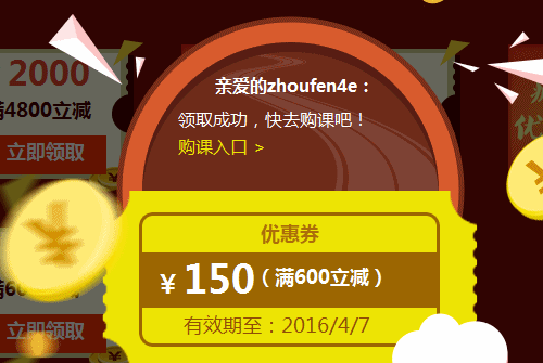 2016年3月1日-31日期间,只要您是网校的注册学员,就可以参与此活动。网校所有注册学员可在活动页面领取折扣优惠券,学员可用此优惠券在选课中心购买课程,交费后即可开始学习!