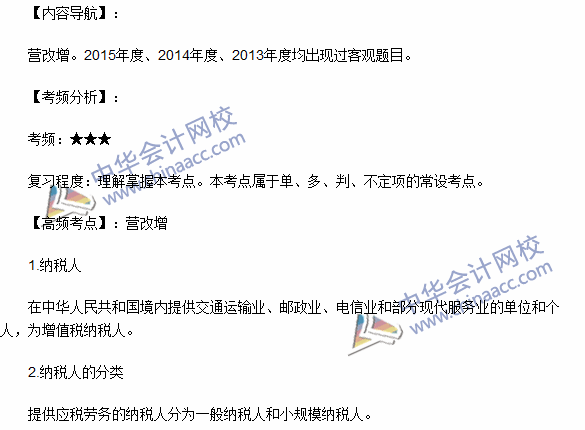 2016年初级会计职称备考已经进入最后的冲刺阶段,为帮助考生们高效备考,正保会计网校教学专家根据丰富的教学经验,整理了初级会计职称各科的高频考点。下面是《经济法基础》第四章增值税、消费税、营业税法律制度第一节增值税法律制度的内容。
