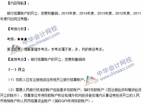 2016年初级会计职称备考已经进入最后的冲刺阶段,为帮助考生们高效备考,正保会计网校教学专家根据丰富的教学经验,整理了初级会计职称各科的高频考点。下面是《经济法基础》第三章支付结算法律制度第二节银行结算账户管理的内容。