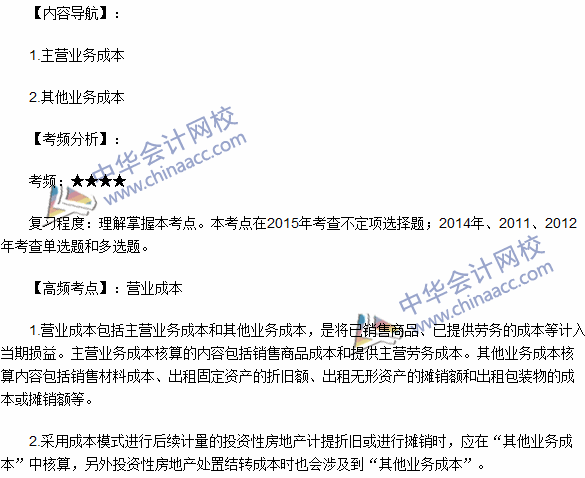 2016年初级会计职称备考已经进入最后的冲刺阶段,为帮助考生们高效备考,正保会计网校教学专家根据丰富的教学经验,整理了初级会计职称各科的高频考点。下面是《初级会计实务》第五章费用第一节营业成本的内容。