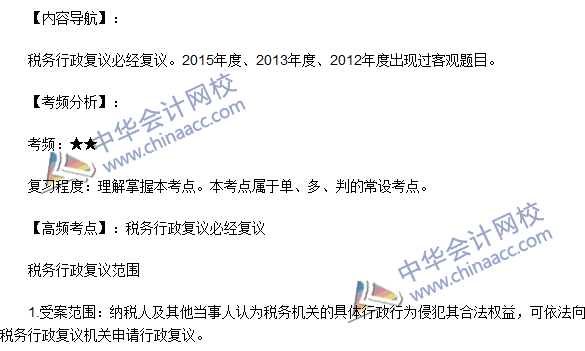 2016年初级会计职称备考已经进入最后的冲刺阶段,为帮助考生们高效备考,正保会计网校教学专家根据丰富的教学经验,整理了初级会计职称各科的高频考点。下面是《经济法基础》第七章税收征收管理法律制度第四节税务行政复议的内容。