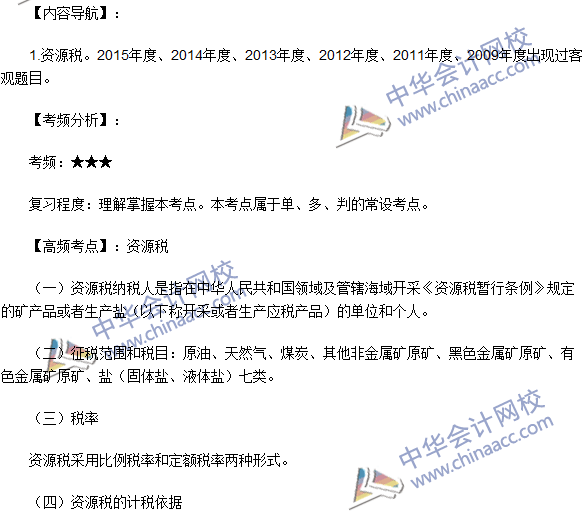 2016年初级会计职称备考已经进入最后的冲刺阶段,为帮助考生们高效备考,正保会计网校教学专家根据丰富的教学经验,整理了初级会计职称各科的高频考点。下面是《经济法基础》第六章其他税收法律制度第八节资源税法律制度的内容。
