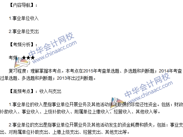 2016年初级会计职称备考已经进入最后的冲刺阶段,为帮助考生们高效备考,正保会计网校教学专家根据丰富的教学经验,整理了初级会计职称各科的高频考点。下面是《初级会计实务》第十章事业单位会计基础第四节收入与支出的内容。