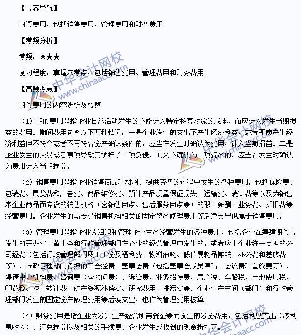 我们一起来学习2013年初级职称《初级会计实务》高频考点:期间费用的内容辨析及核算。本考点属于《初级会计实务》第五章费用第三节期间费用的内容。