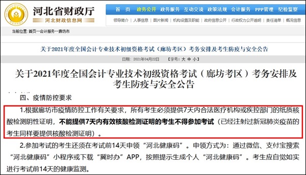廊坊:根据廊坊市疫情防控工作有关要求,所有考生必须提供7天内合法医疗机构或疾控部门的纸质核酸检测阴性证明,不能提供7天内有效核酸检测证明的考生不得参加考试(已经注射过新冠肺炎疫苗的考生同样要提供核酸检测证明)。