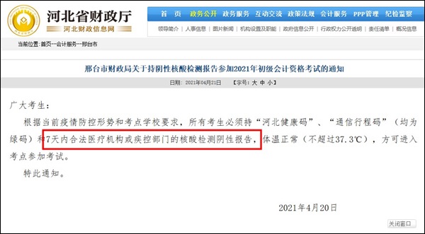 邢台:根据当前疫情防控形势和考点学校要求,所有考生必须持“河北健康码”、“通信行程码”(均为绿码)和7天内合法医疗机构或疾控部门的核酸检测阴性报告(纸质版),体温正常(不超过37.3℃),方可进入考点参加考试