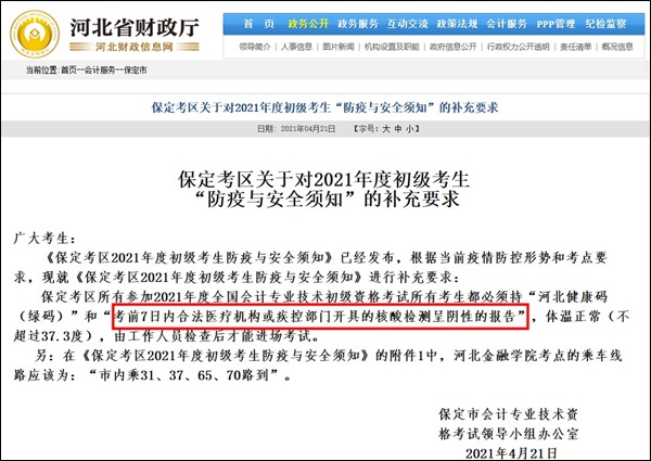 保定:参加考试的考生须在考试前14天申领“河北健康码”,填报个人健康信息承诺书。持“河北健康码(绿码)”和“考前7日内合法医疗机构或疾控部门开具的核酸检测呈阴性的报告(纸质版),体温正常(不超过37.3度)
