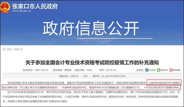 目前没有地区对考生接种疫苗有强制要求。但河北张家口、云南省官方在考生防疫中对接种新冠疫苗有一定说明: