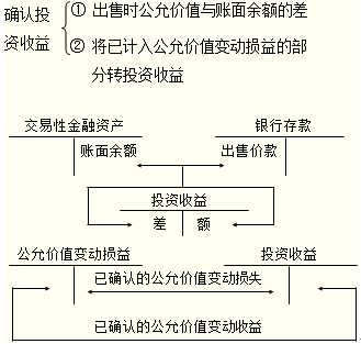 出售交易性金融资产时,应将出售时的公允价值与其账面余额之间的差额确认为当期投资收益;同时调整公允价值变动损益。