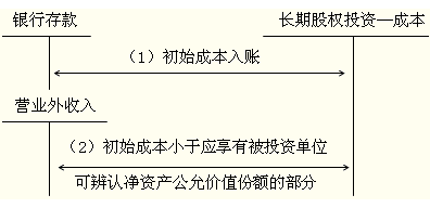 1.取得长期股权投资时,初始投资成本大于投资时应享有被投资单位可辨认净资产公允价值份额的,不调整长期股权投资的初始投资成本;初始投资成本小于投资时应享有被投资单位可辨认净资产公允价值份额的,其差额计入当期损益(营业外收入),同时调整长期股权投资的成本。