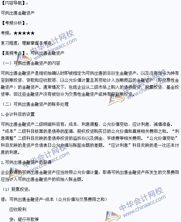 我们一起来学习2014初级会计职称考试《初级会计实务》高频考点:可供出售金融资产。本考点属于《初级会计实务》第一章资产第七节可供出售金融资产的内容。