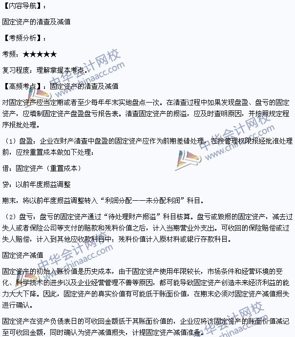 我们一起来学习2014初级会计职称考试《初级会计实务》高频考点:固定资产的清查及减值。本考点属于《初级会计实务》第一章资产第八节固定资产和投资性房地产的内容。