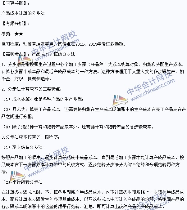我们一起来学习2014初级会计职称《初级会计实务》高频考点:产品成本计算的分步法。本考点属于《初级会计实务》第九章产品成本计算与分析第三节产品成本计算的分步法的内容。