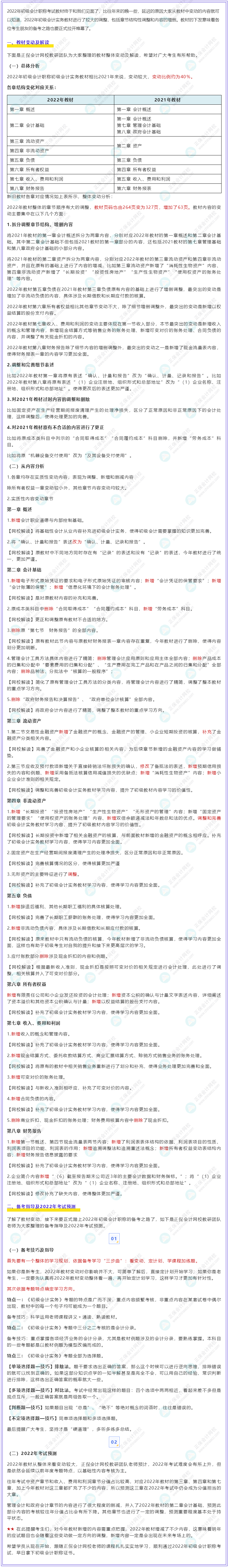 为方便各位考生了解考试新、旧教材变化详情,正保会计网校教研团队老师特整理了2022年《初级会计实务》考试教材与2021年教材的变动解读,希望可以帮助大家更好备考,详情如下: