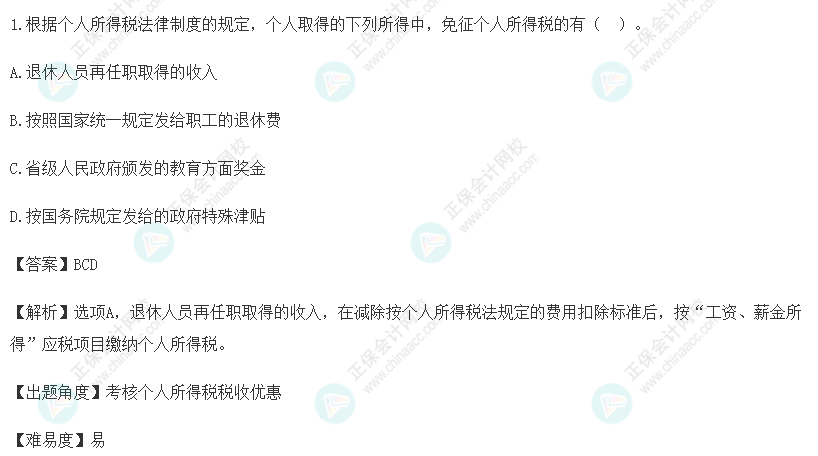 【点评】本题考核“个人所得税税收优惠—免税、减税项目”知识点。该题目所涉及知识点在下列正保会计网校(www.fawtography.com)2023年初级职称《经济法基础》辅导中均有体现:侯永斌老师【高效实验班】、【尊享无忧班】基础精讲第六技第17讲;武子赫老师【C位夺魁班】逐章精讲第五章经营所得等应纳税额计算、个税税收优惠和征管、第六章房产税(2023.3.20);张稳老师2023年《经济法基础•经典题解》(打基础)第209页知识点;正保会计网校2023年《经济法基础•必背法条TOP X》第224页第3题;考试中心开通的摸底试卷(一)试题多选题第24题;考试中心开通的模拟试卷(一)试题单选题第16题。