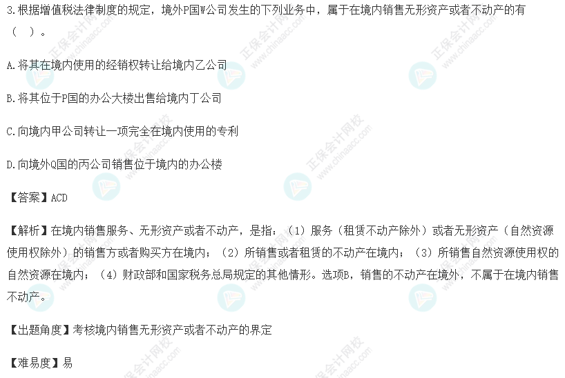 【点评】本题考核“境内销售服务、无形资产或者不动产的界定”知识点。该题目所涉及知识点在下列正保会计网校(www.fawtography.com)2023年初级职称《经济法基础》辅导中均有体现:侯永斌老师【高效实验班】、【尊享无忧班】基础精讲第五技第05讲;杨军老师【超值精品班】基础精讲第五章第03讲;侯永斌老师2023年《经济法基础•应试指南》第220页知识点;侯永斌老师2023年《初级冲刺必刷模拟试卷》第36页第6题;考试中心开通的单选题。