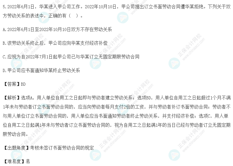 【点评】本题考核“未签订书面劳动合同的规定”知识点。该题目所涉及知识点在下列正保会计网校(www.fawtography.com)2023年初级职称《经济法基础》辅导中均有体现: