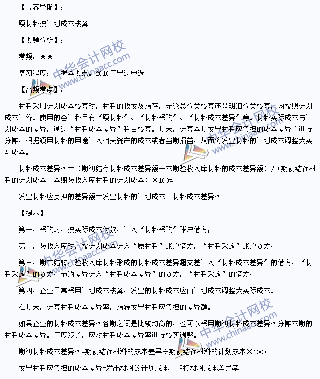 我们一起来学习2013初级会计职称《初级会计实务》高频考点:原材料按计划成本核算。本考点属于《初级会计实务》第一章资产第四节存货的内容。