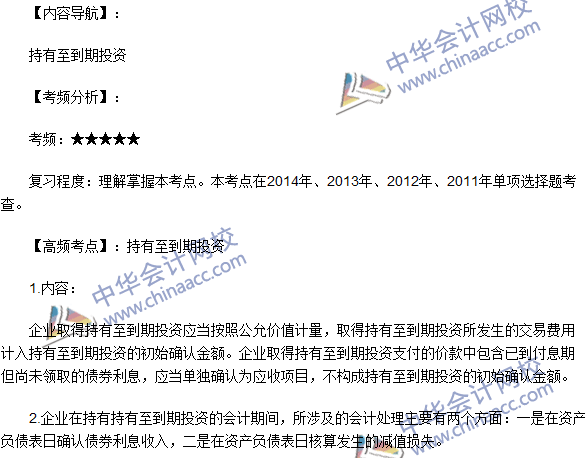 2016年初级会计职称备考已经进入最后的冲刺阶段,为帮助考生们高效备考,正保会计网校教学专家根据丰富的教学经验,整理了初级会计职称各科的高频考点。下面是《初级会计实务》第一章资产第五节持有至到期投资的内容。