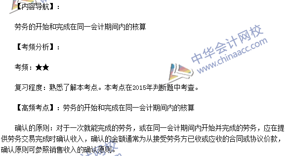 2016年初级会计职称备考已经进入最后的冲刺阶段,为帮助考生们高效备考,正保会计网校教学专家根据丰富的教学经验,整理了初级会计职称各科的高频考点。下面是《初级会计实务》第四章资产第二节提供劳务收入的内容。